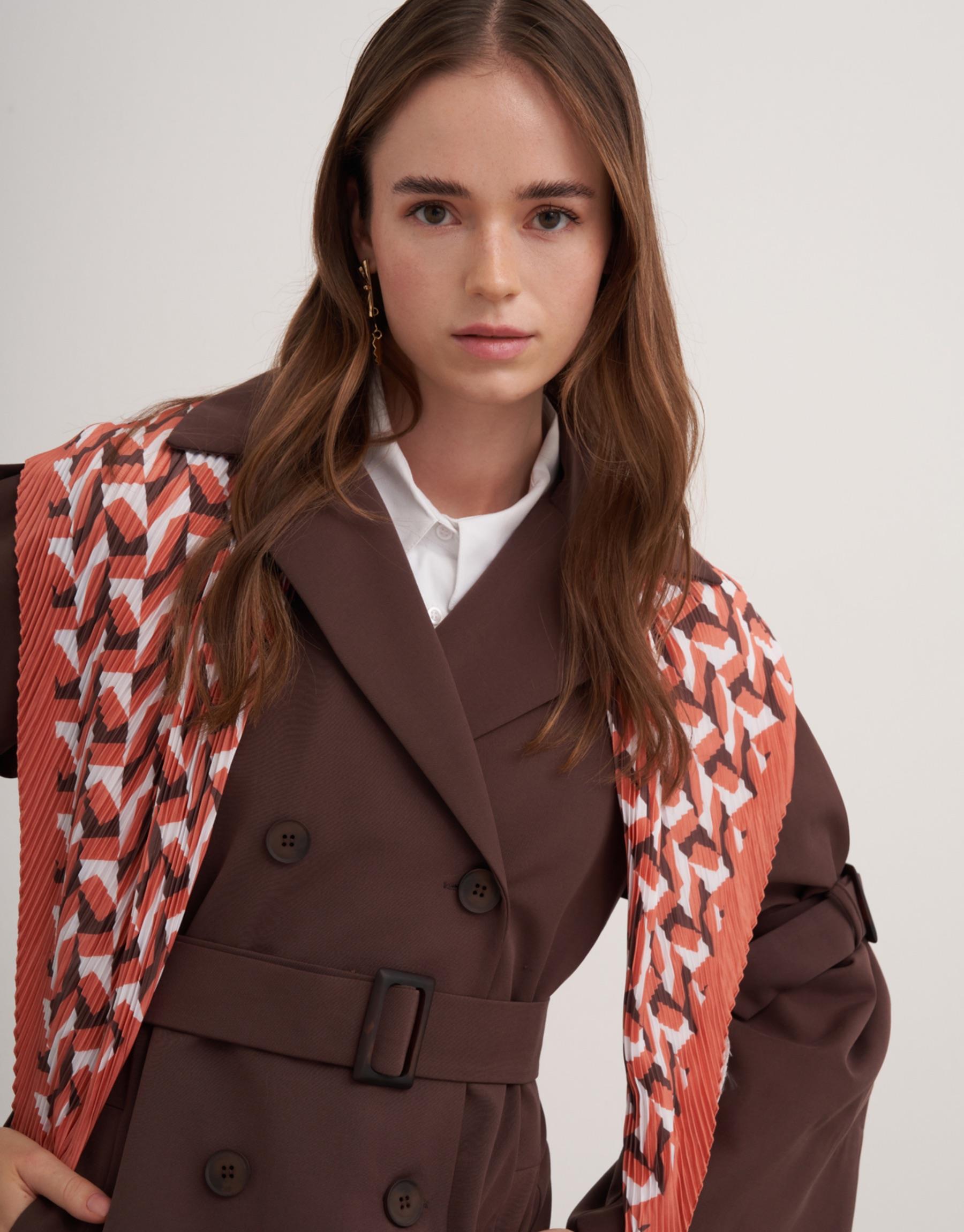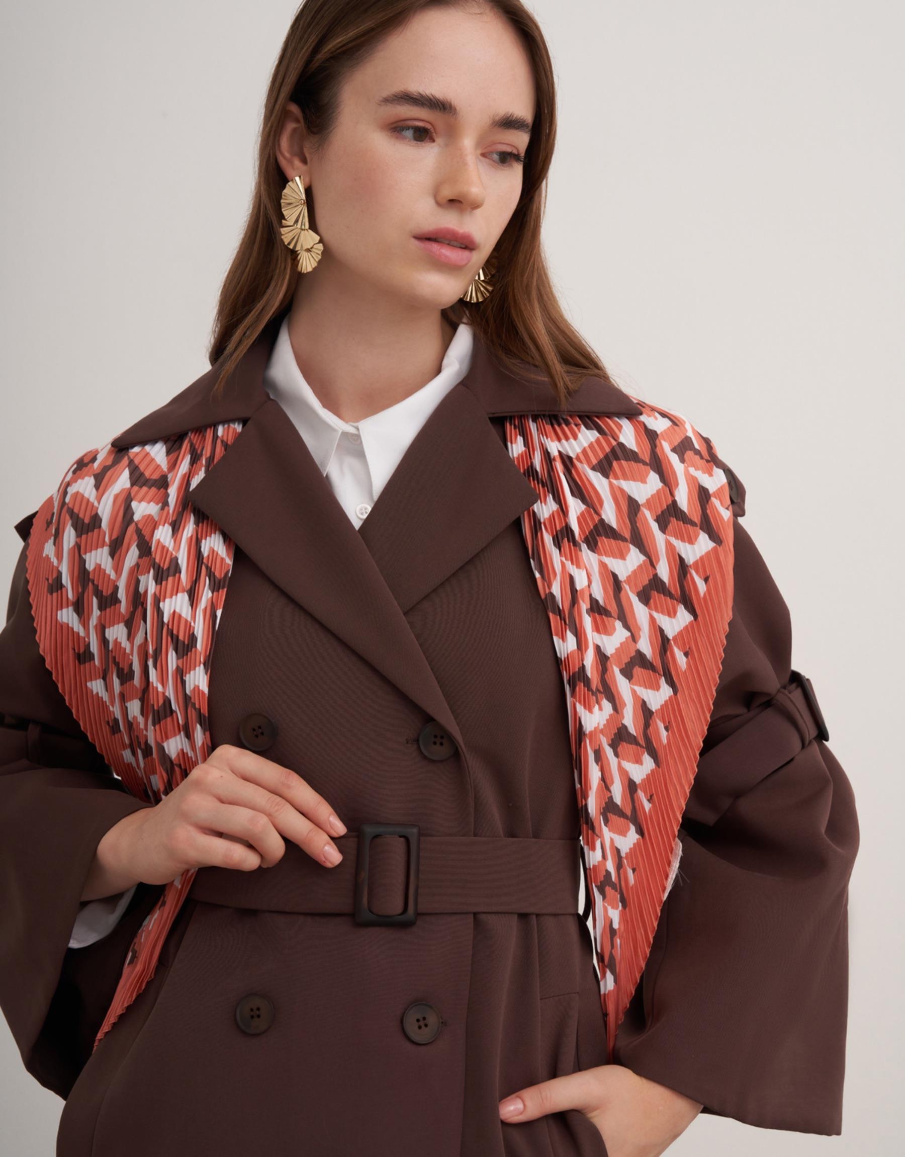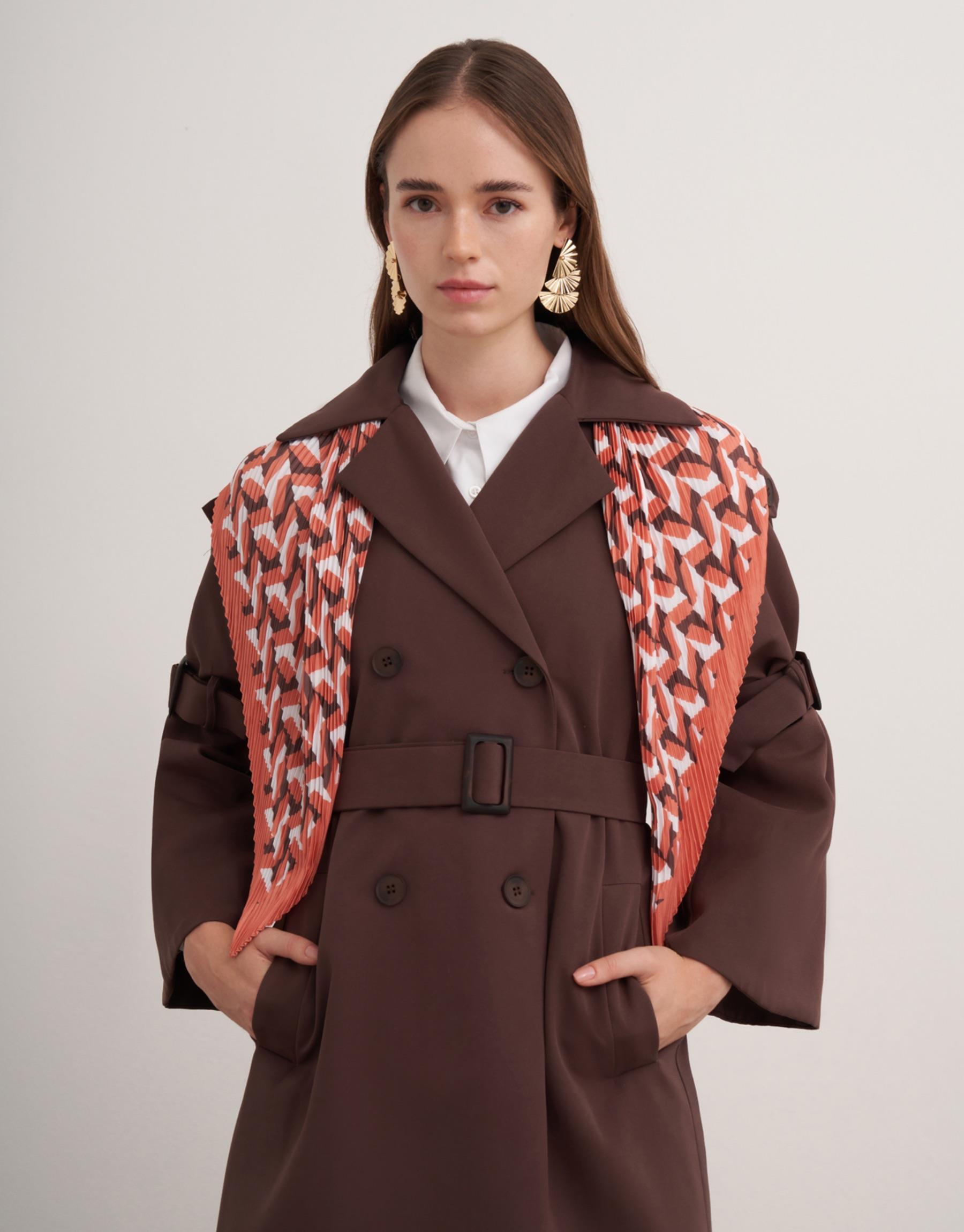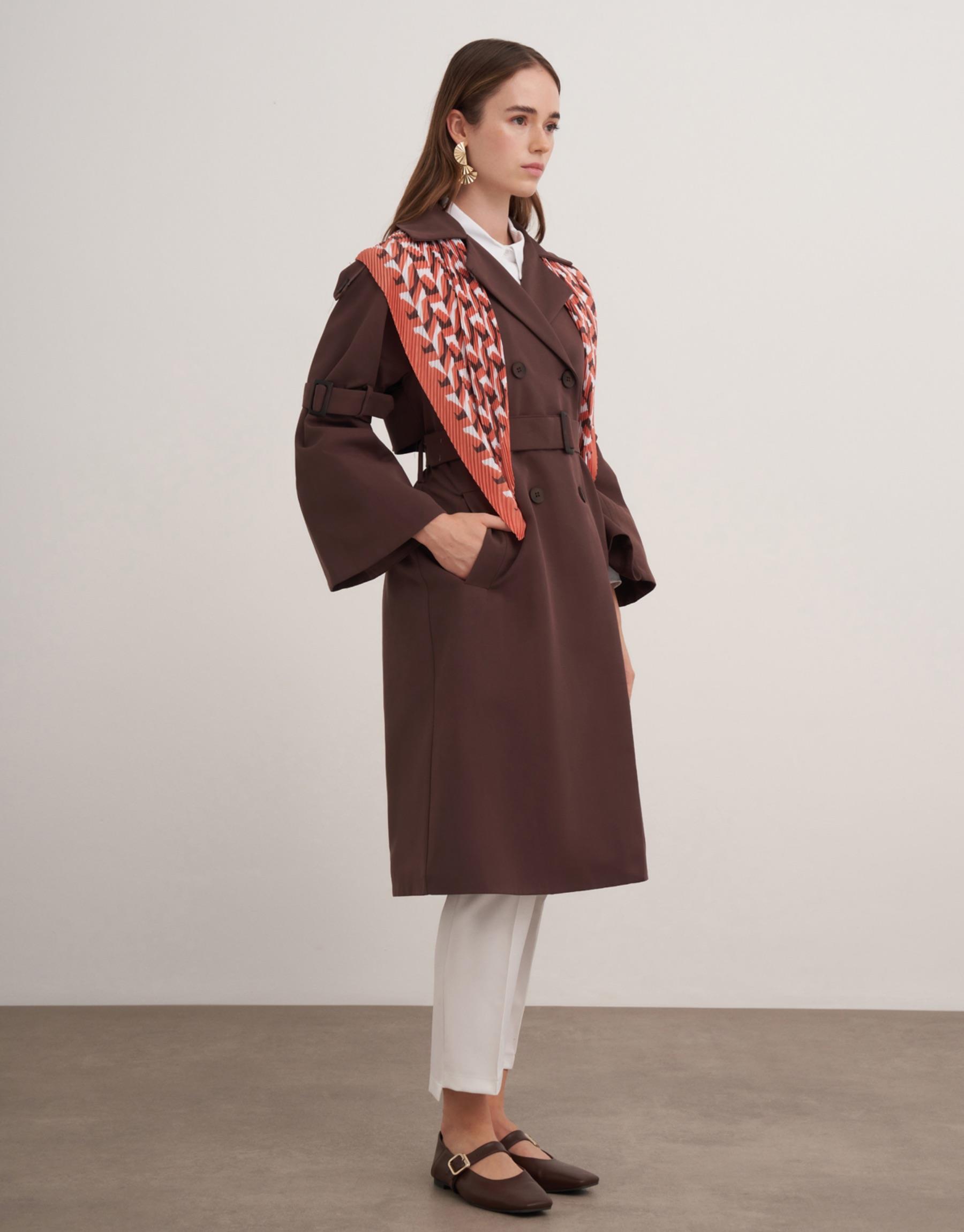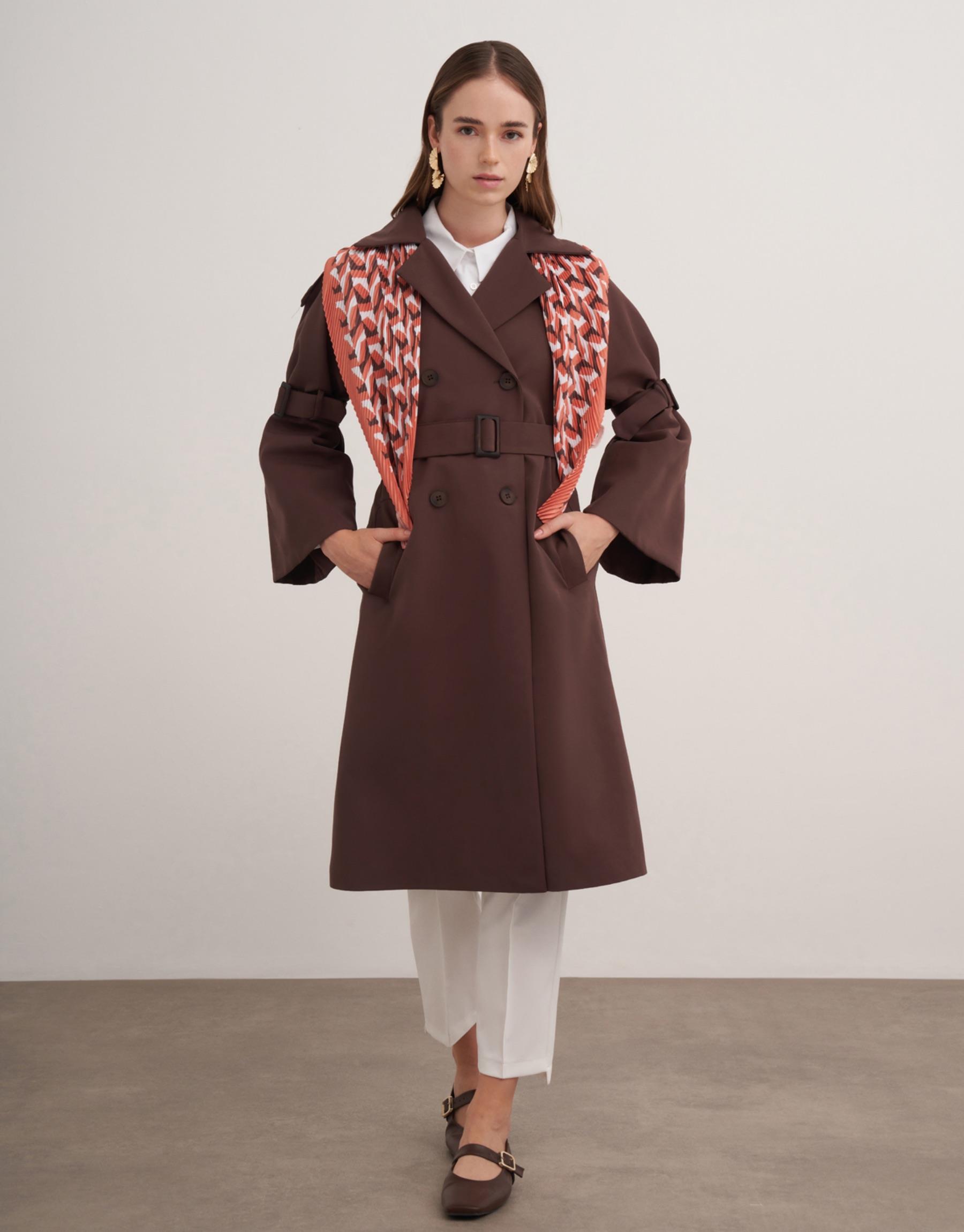 Ön düğmeli, İspanyol model kol olup aynı zamanda kol kemerli, yan cepli trençkot.