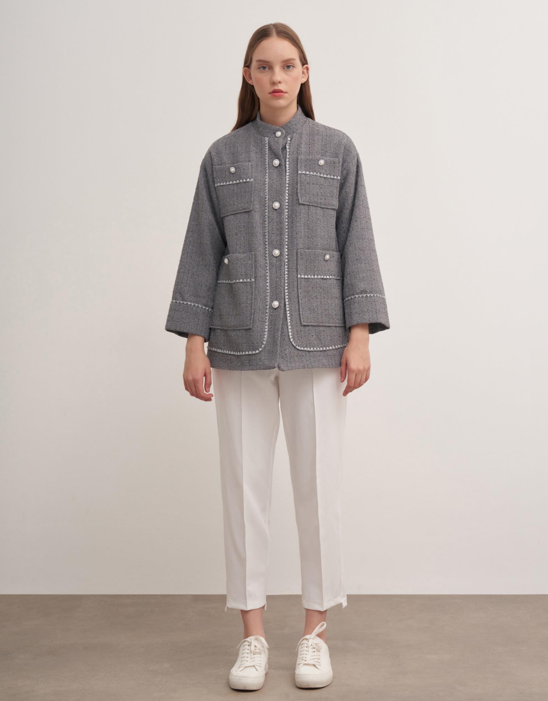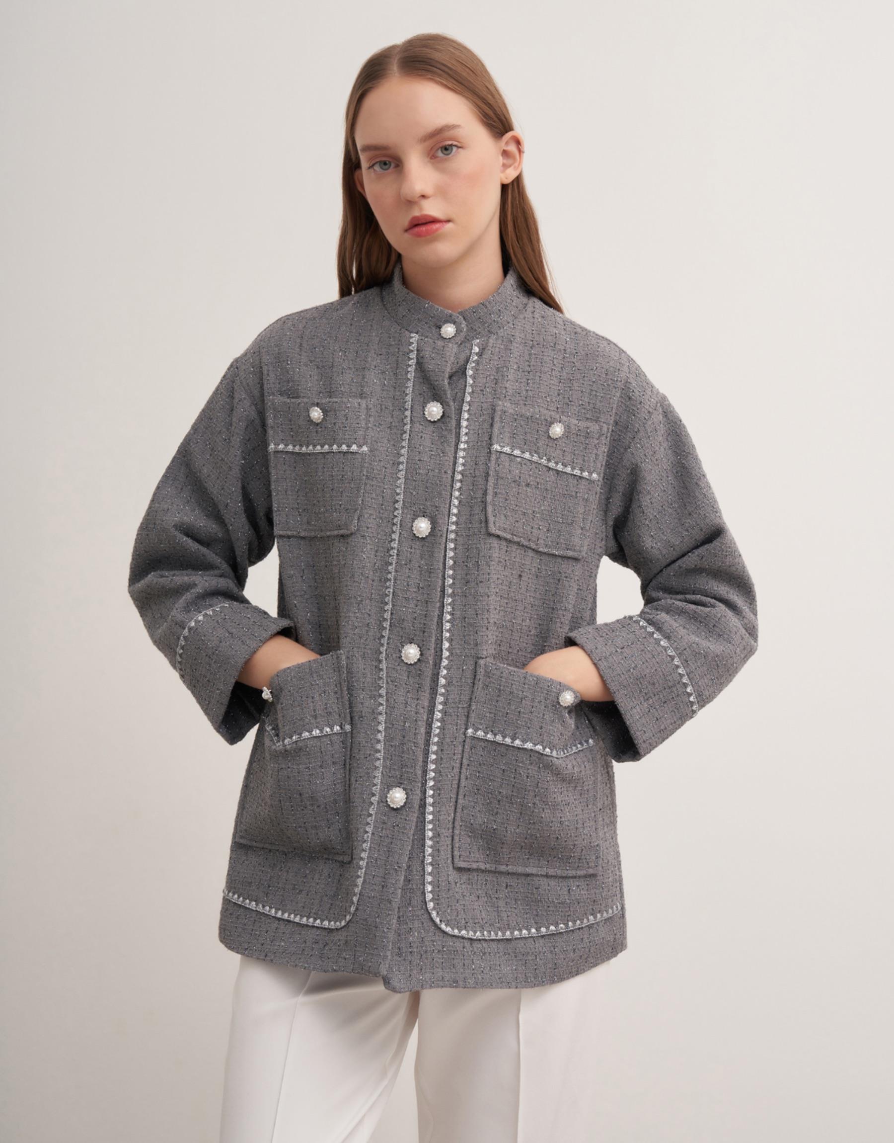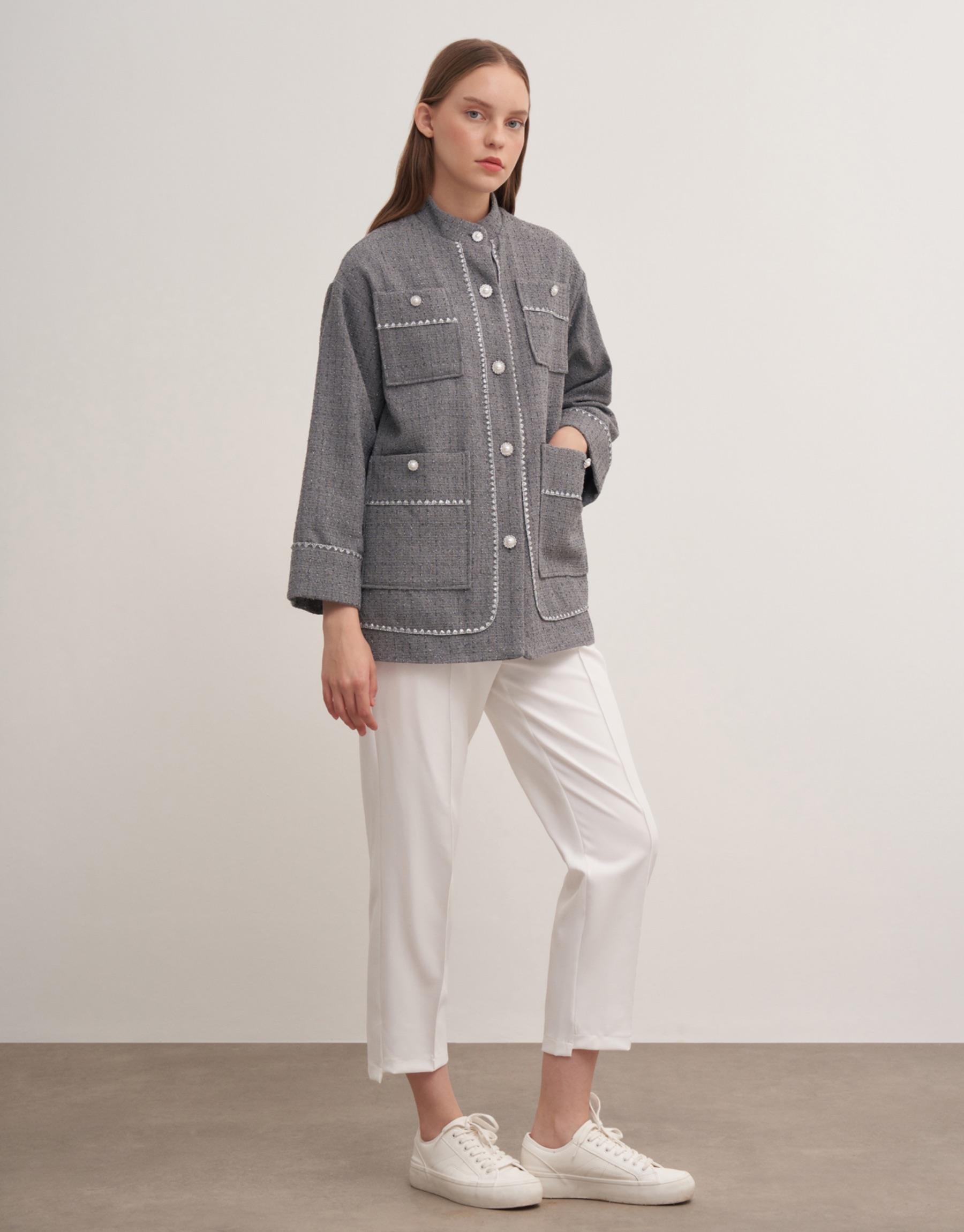 İnci düğmeli ön cepli astarlı Şanel ceket. Ceket boy 73cm göğüs ölçüsü 55cmdir.