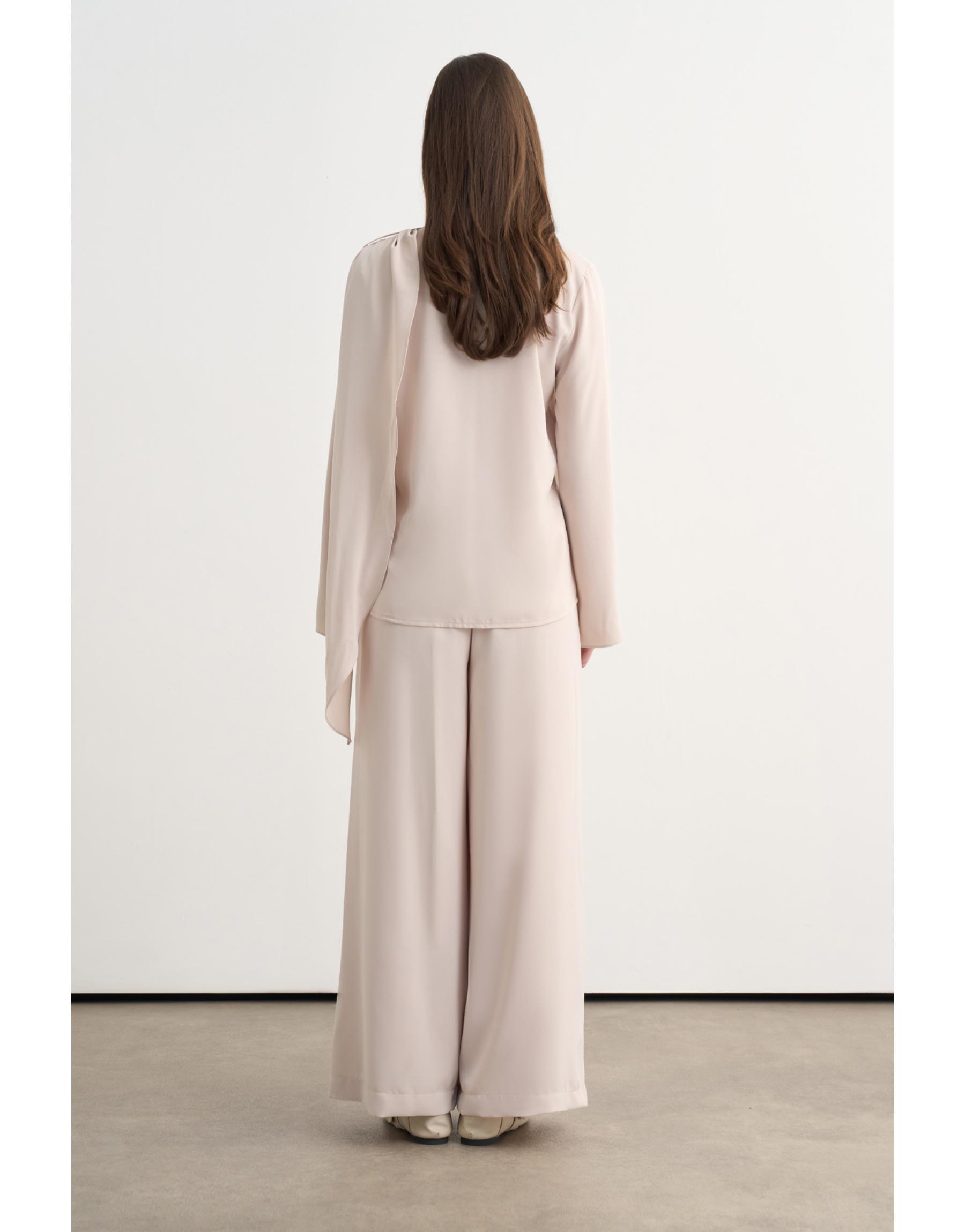 Saten kumaşın akışkan dokusuyla tasarlanan bu ikili takım, günün her anına uyum sağlayan modern ve net bir siluet sunar. Hafif parlak yüzeyiyle zarif bir duruş sergilerken, konforlu kesimi sayesinde hareket özgürlüğü sağlar. Gömlek ve pantolon uyumu, güçlü ama abartısız bir stil oluşturur.