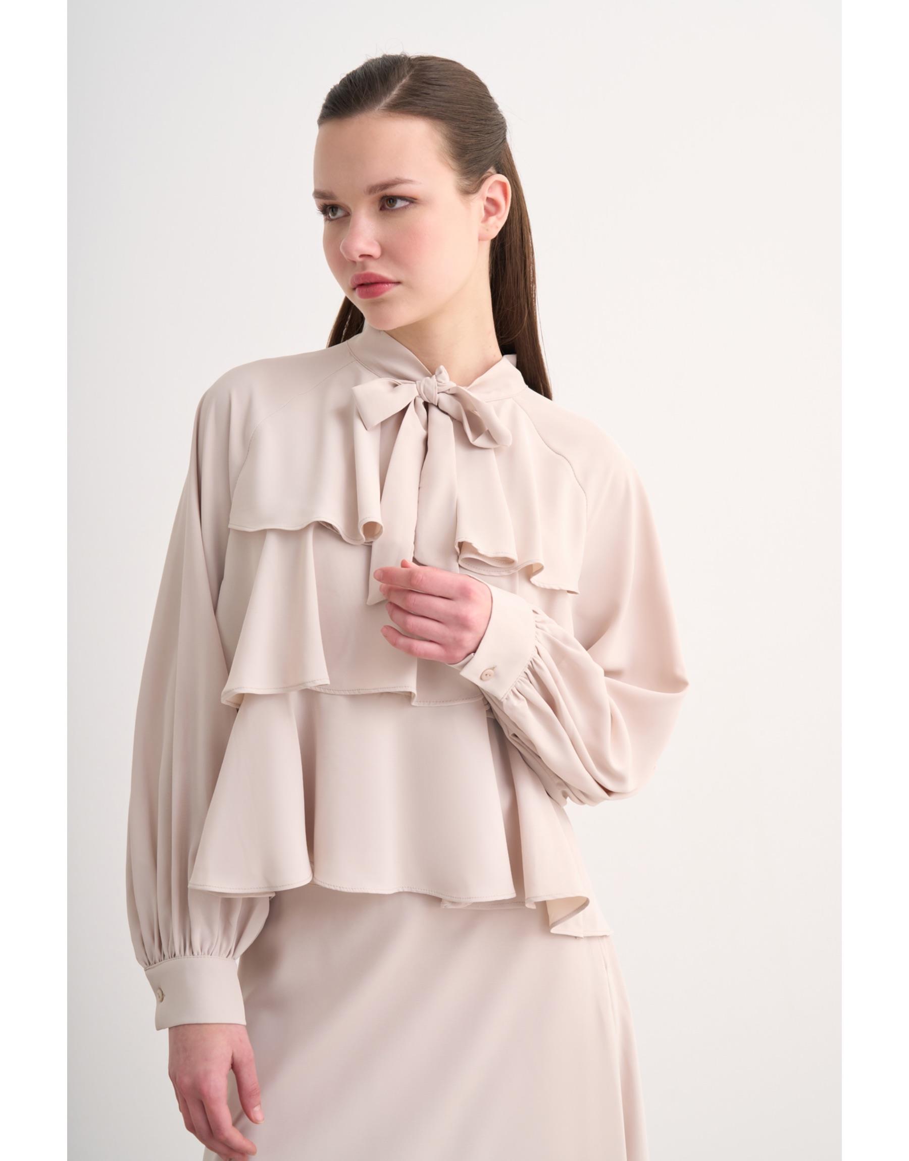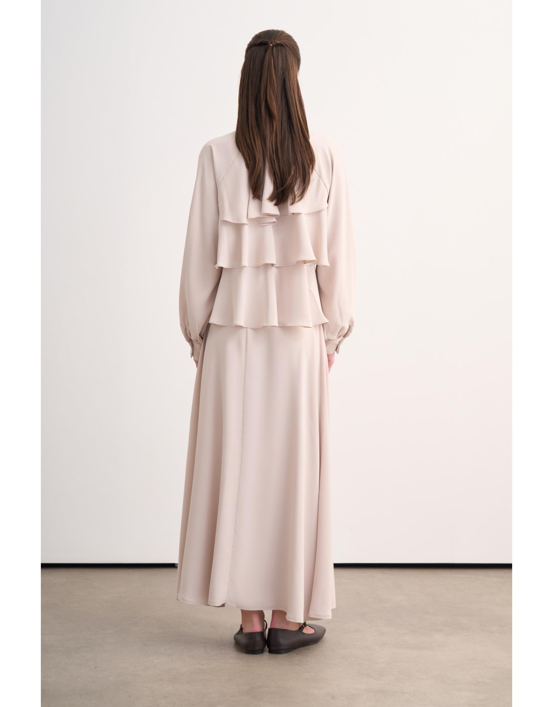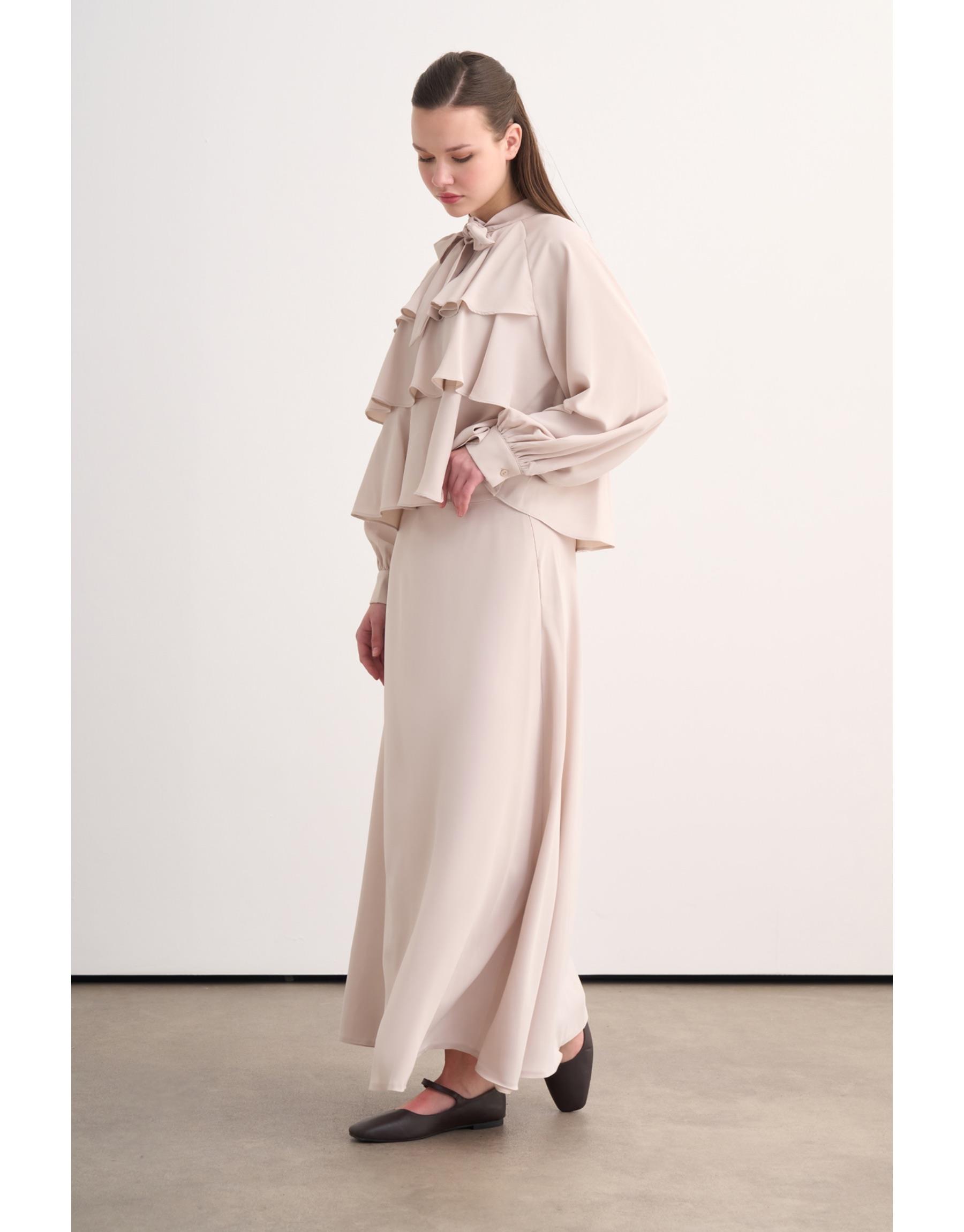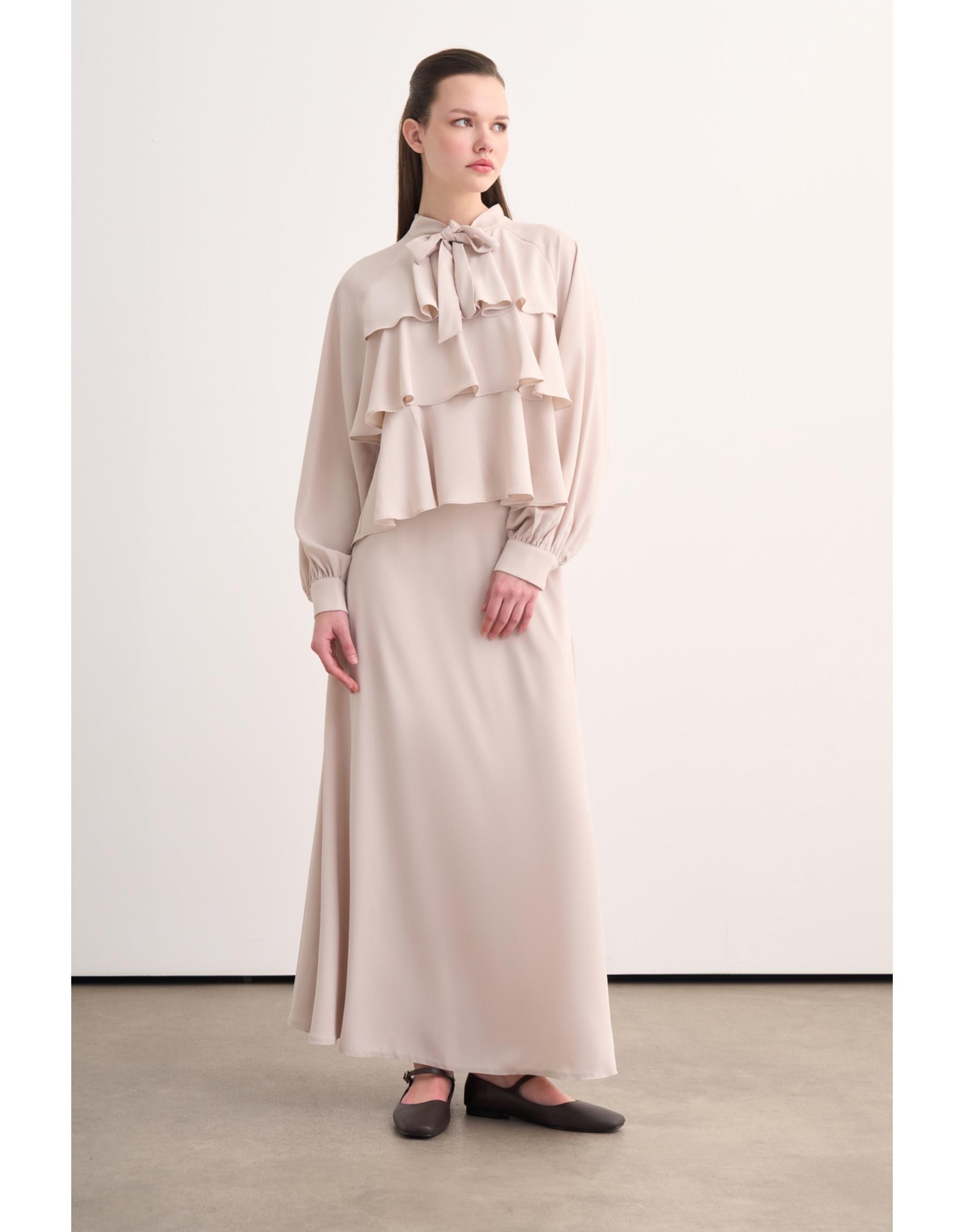 Akışkan saten dokusu ve katmanlı fırfır detaylarıyla öne çıkan bu gömlek etek takım, güçlü bir silueti zarif bir hareketle tamamlar. Ön yüzündeki kat kat form, klasik çizgiyi modern bir ifadeye taşırken; yumuşak dökümlü kumaş gün boyu konfor sağlar.