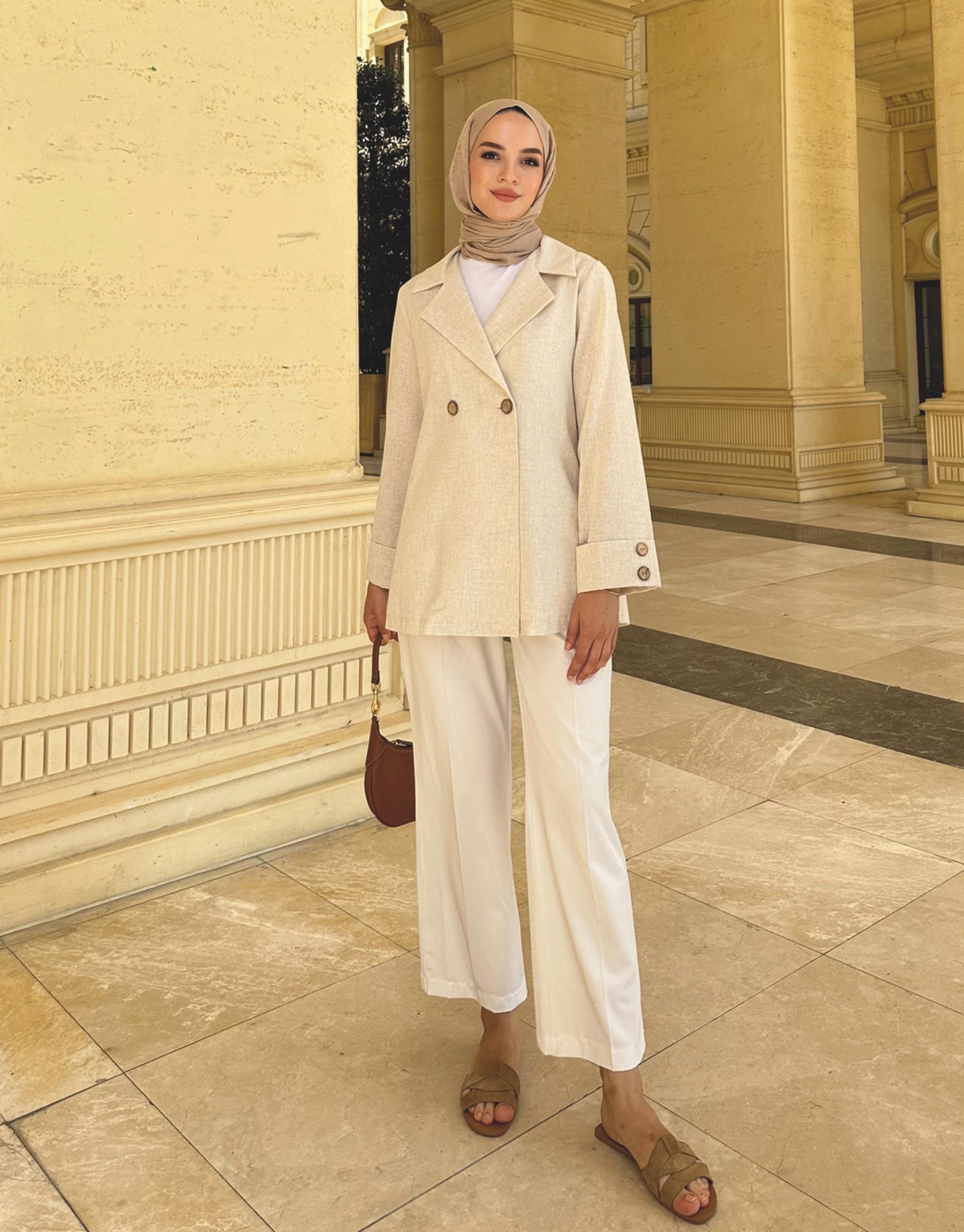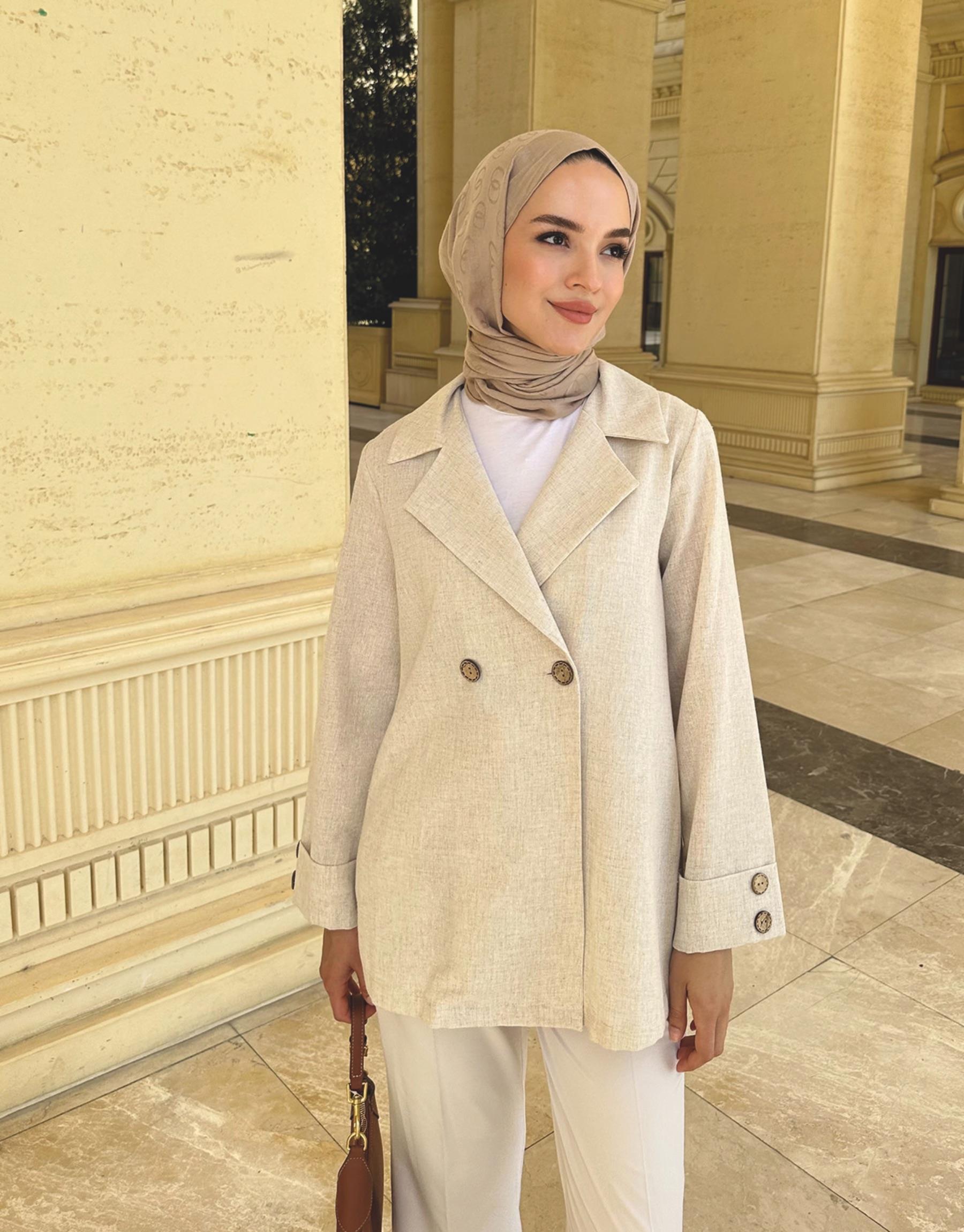 Kolları süs düğmeli keten ceket. Ceket boy 75cm, göğüs ölçüsü 50cm dir.