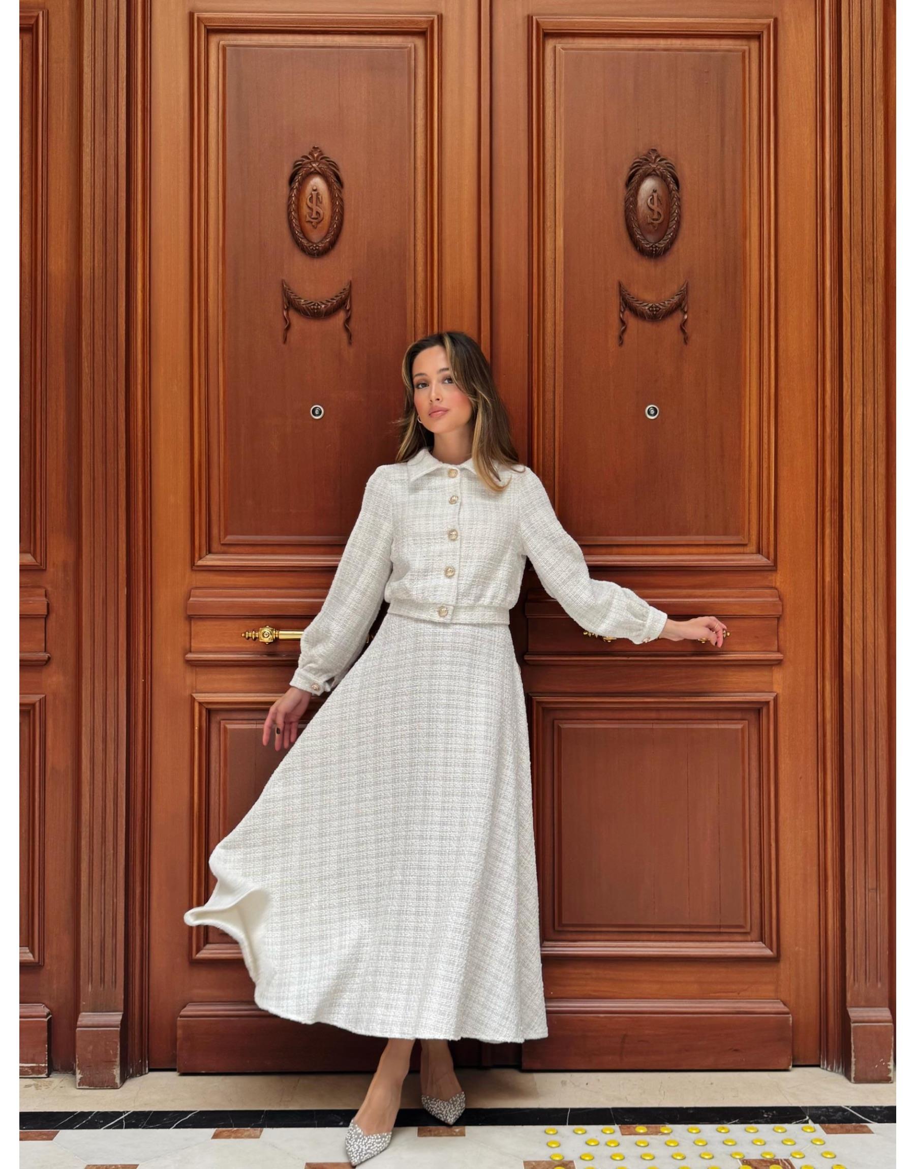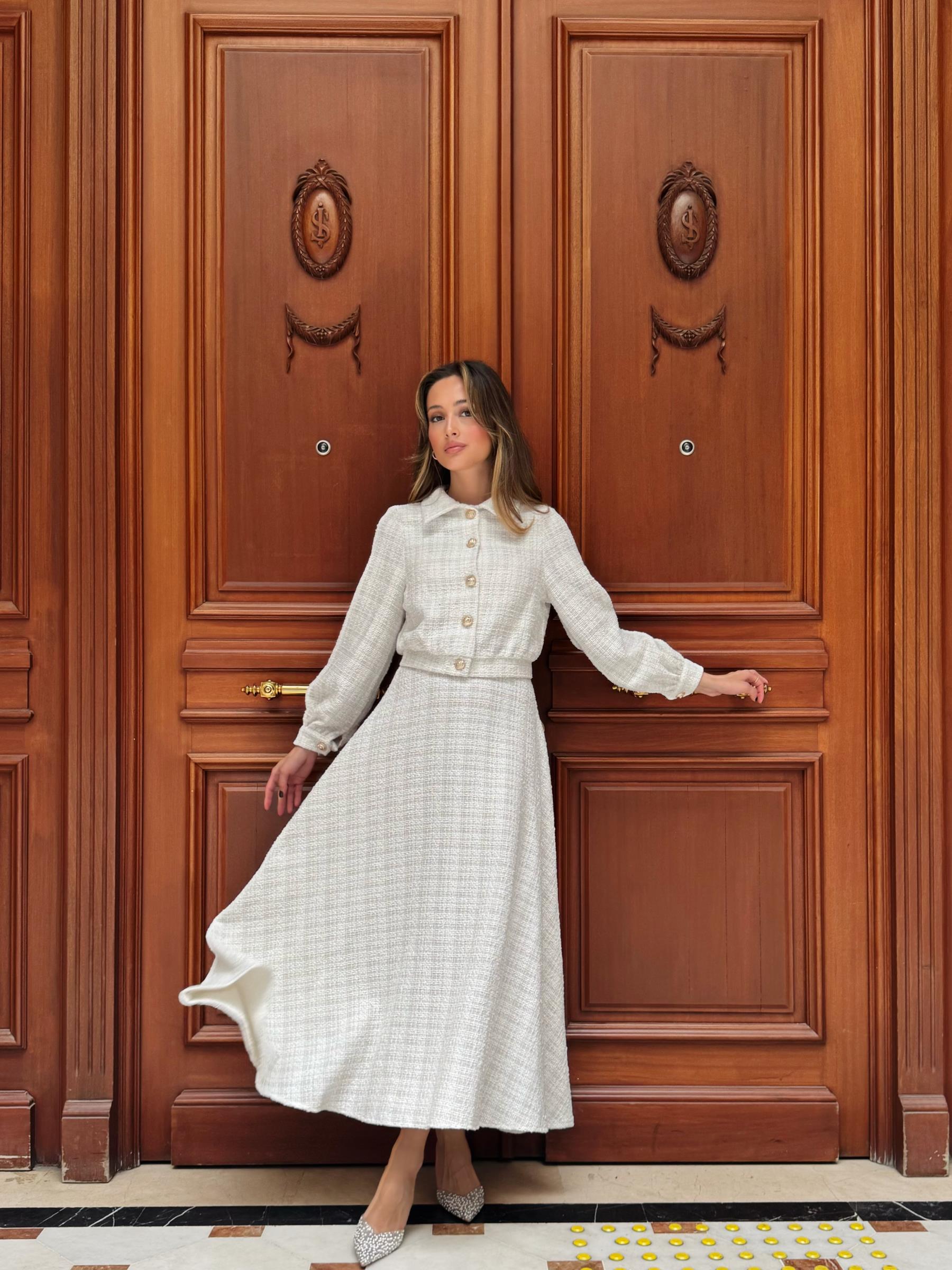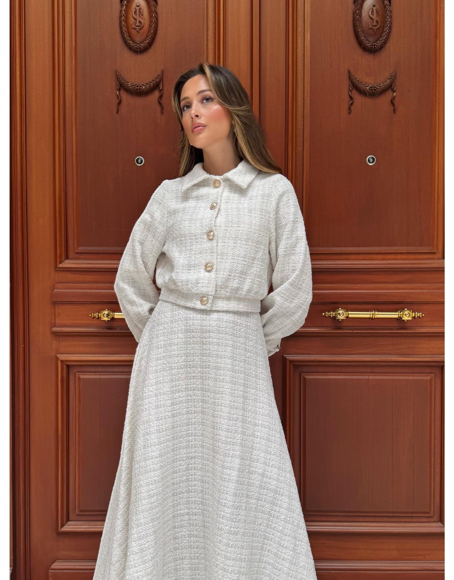 Ceketi garni detaylı, simli shannel kumaş etekli takım.