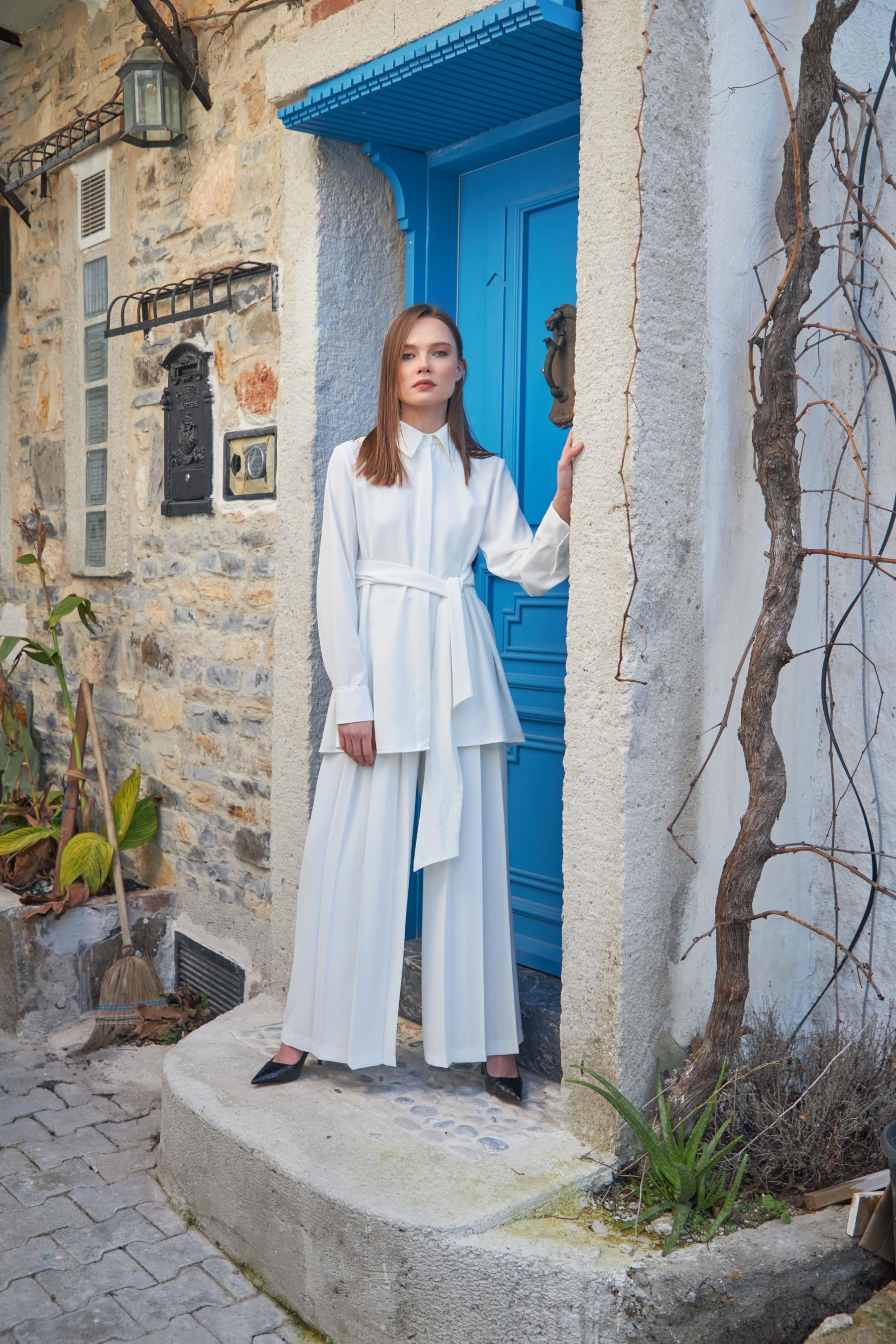 Tunik arkası ve pantolon önü pile detaylı, kullanım çeşidi sağlayan seyyar kuşaklı pantolonlu takım.