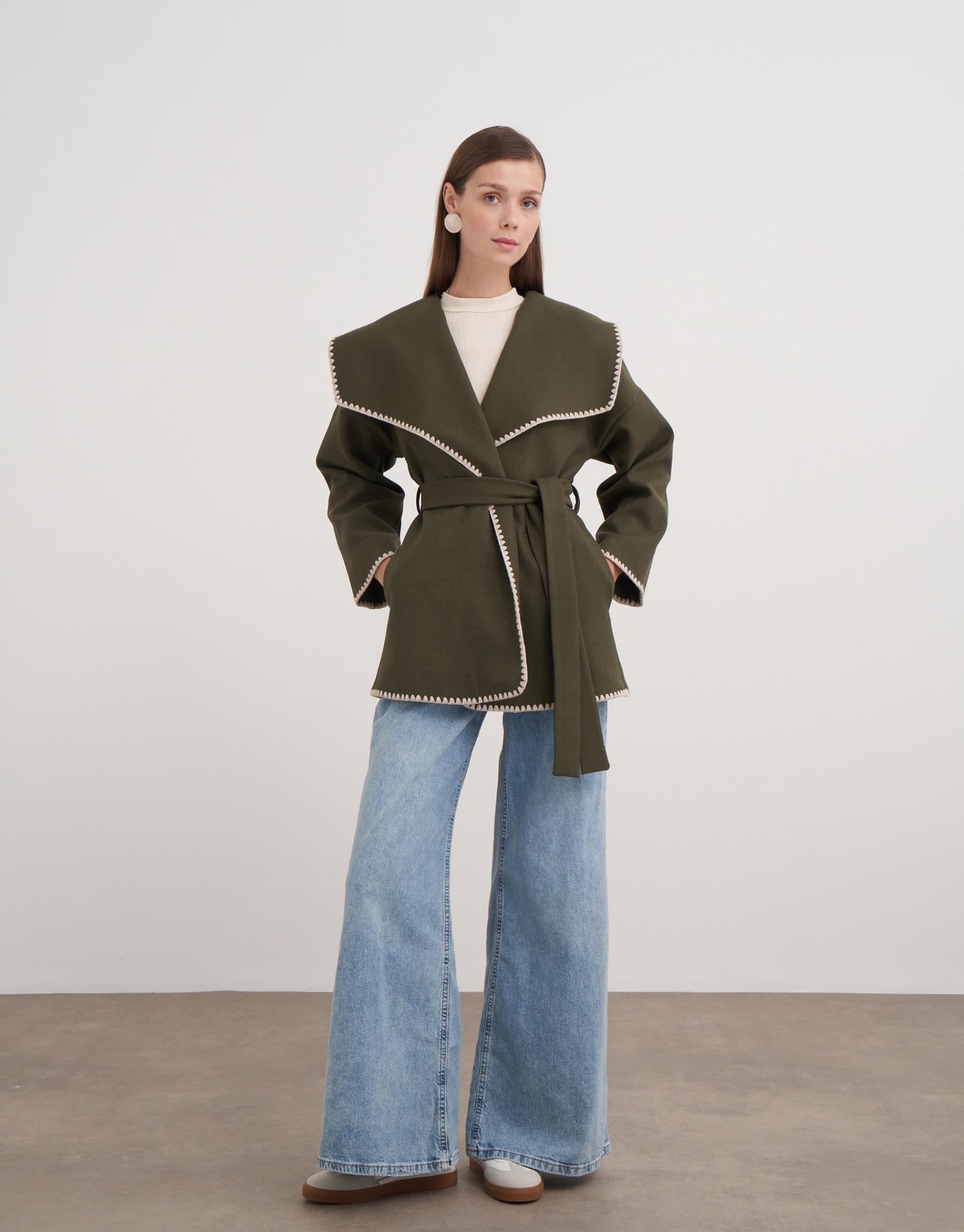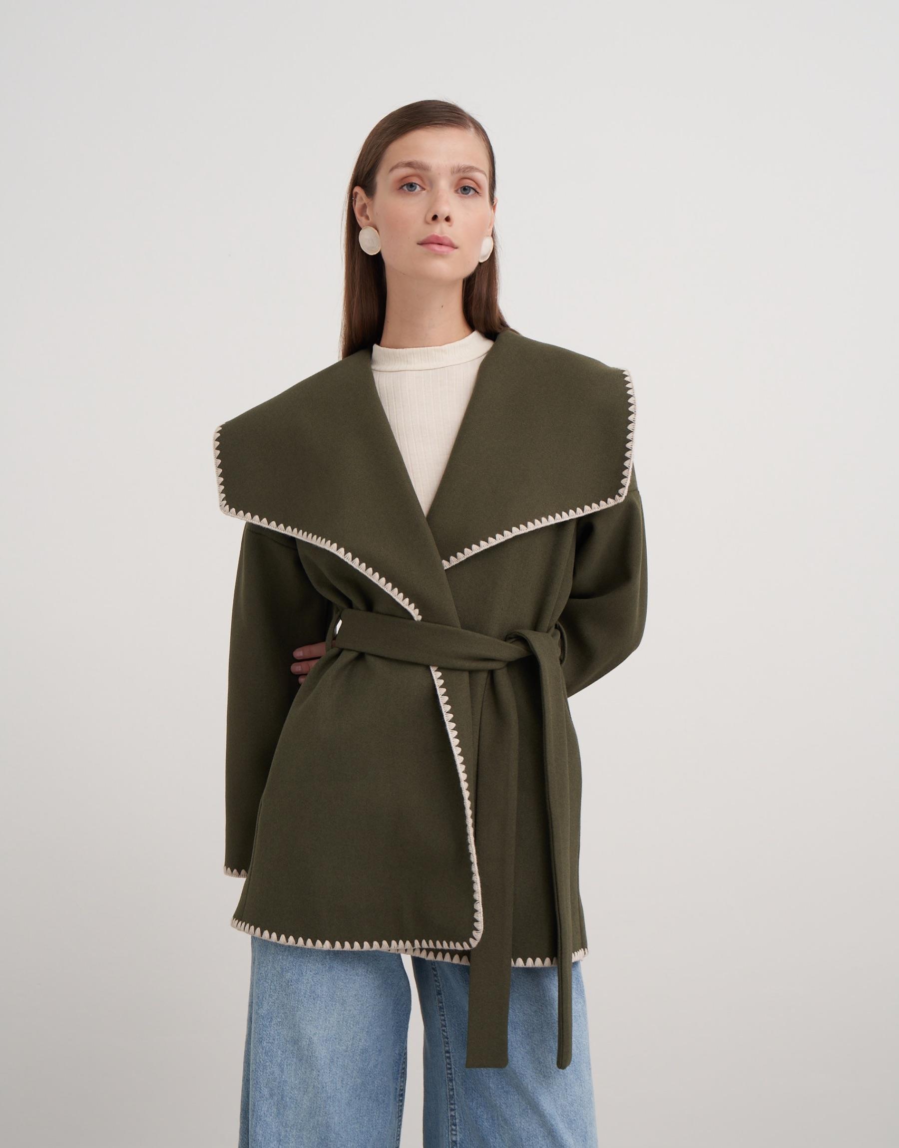 Şal yaka, ön bağlamalı ve yan cepli, astarlı kaşe kap. Kap boy 80cm göğüs ölçüsü 60cm dir.