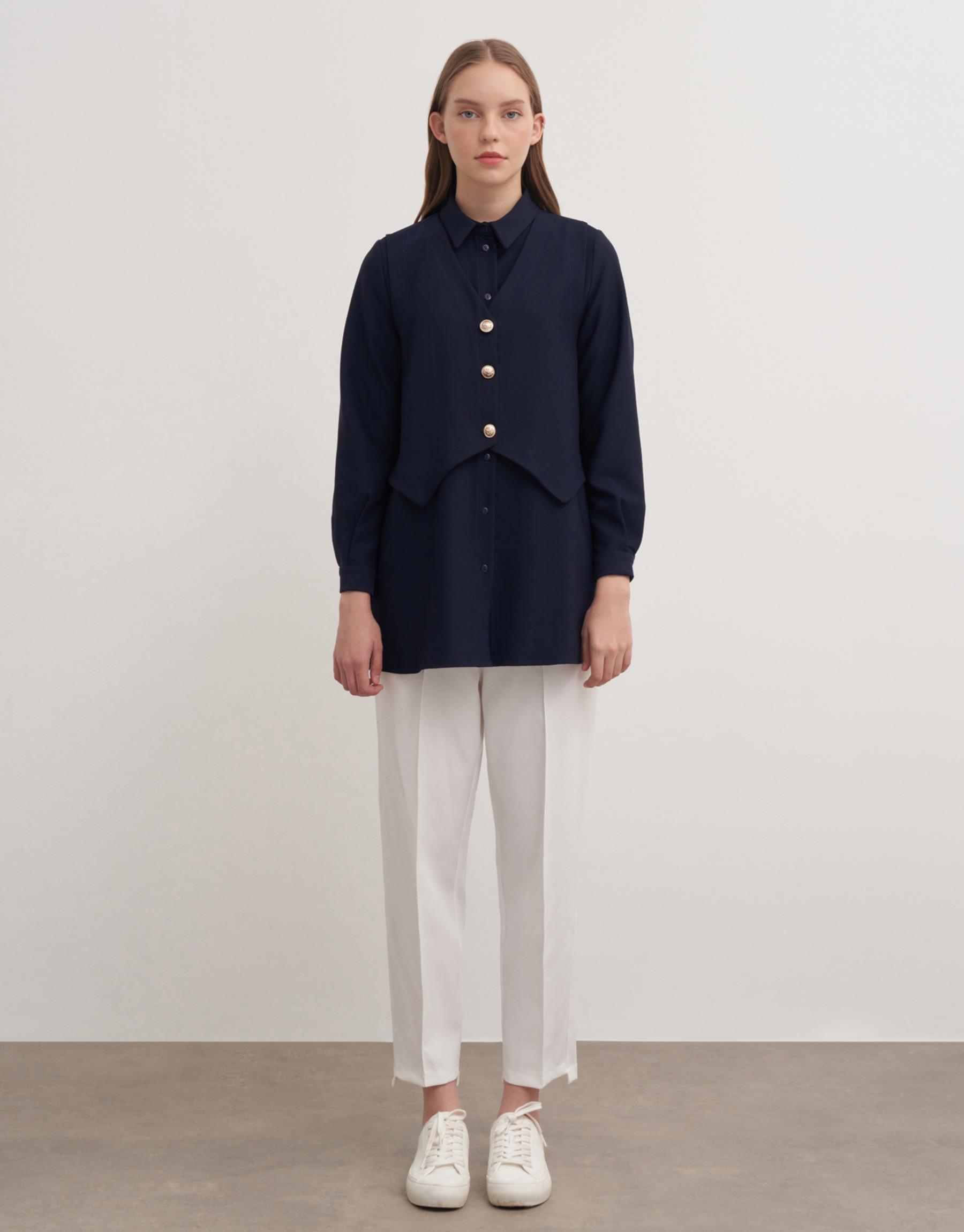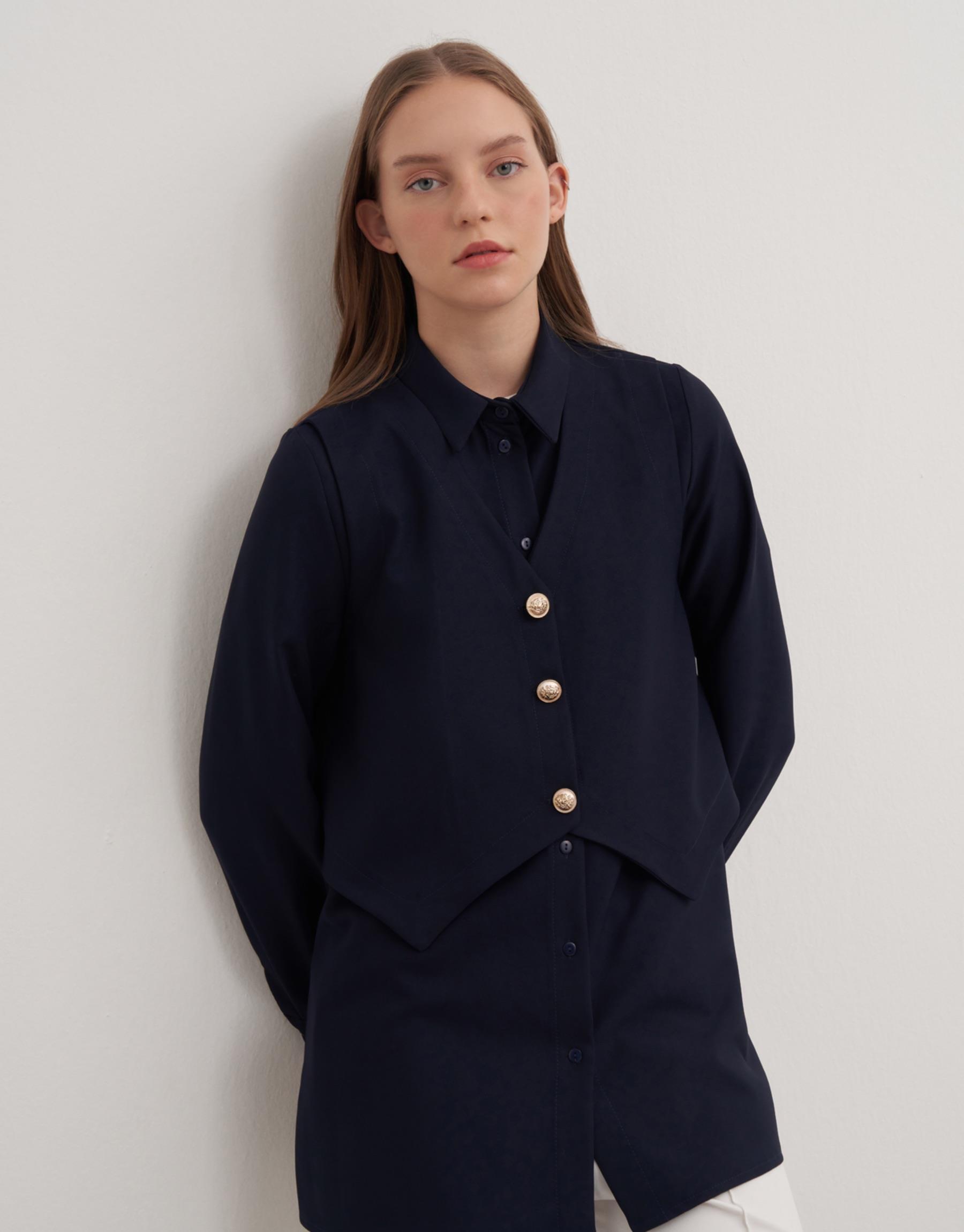 Düğmeli detaylı yelekli dauble krep kumaş gömlek. Gömlek boy 79cm göğüs ölçüsü 50cmdir.