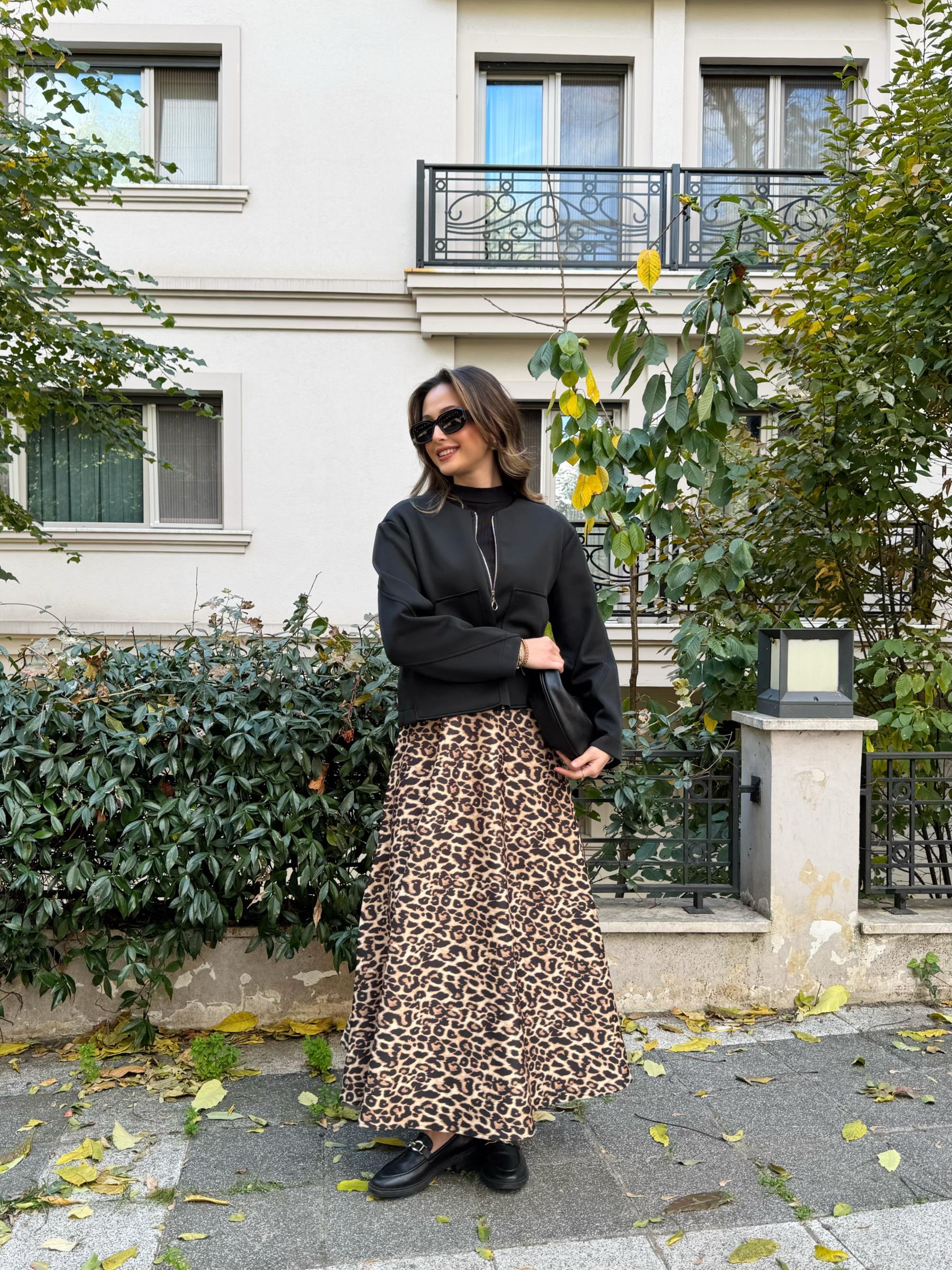 Scuba kumaş ceket ve saten kumaş etekli takım.
