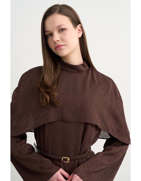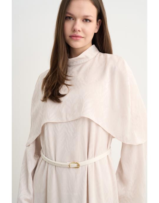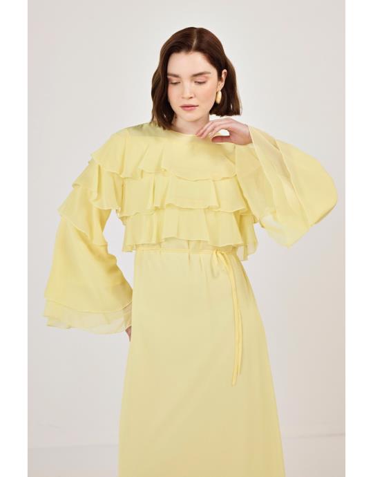 Şifon kumaşın hafif ve akışkan yapısıyla tasarlanan bu elbise, zarif ve dengeli bir siluet sunar. İnce dokusu hareketle birlikte yumuşak bir form kazanırken, iç astarı sayesinde konforlu ve güvenli bir kullanım sağlar.
