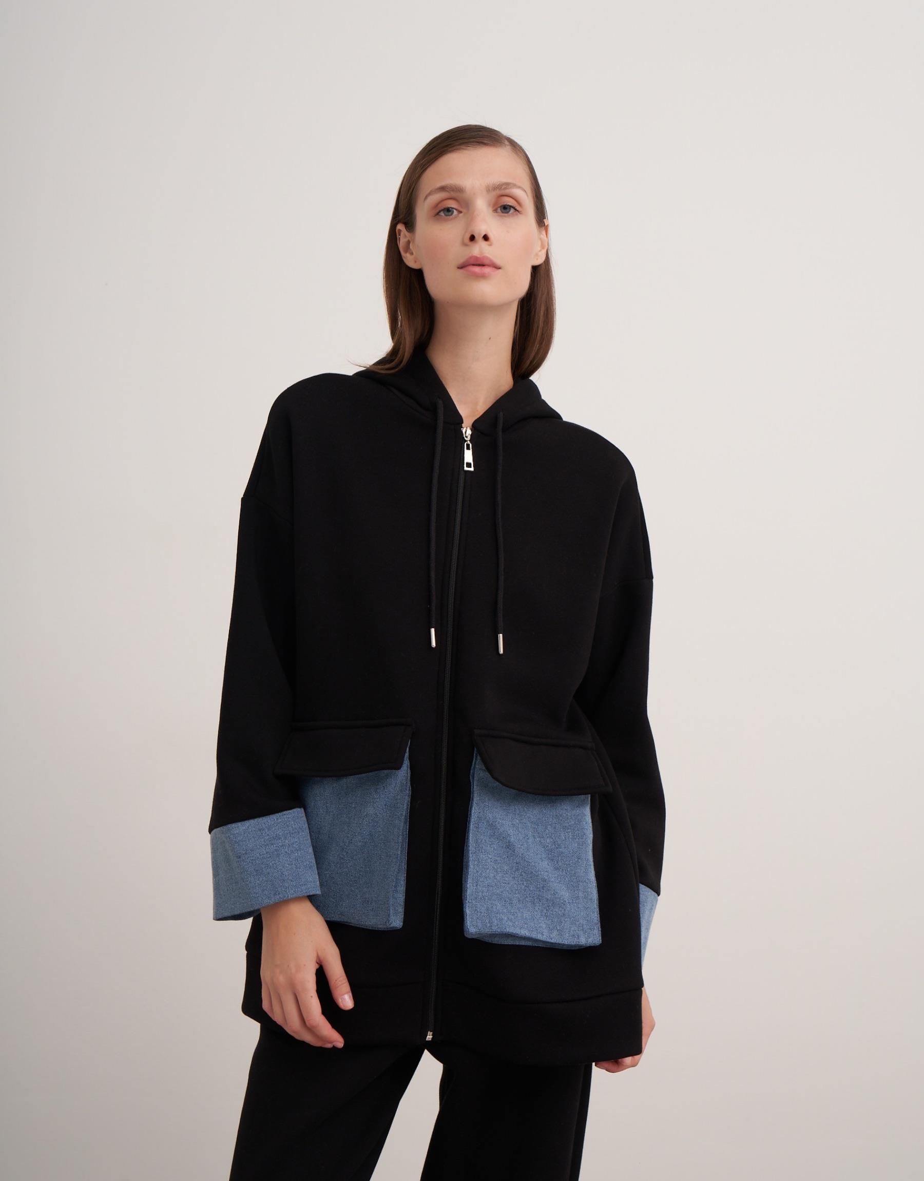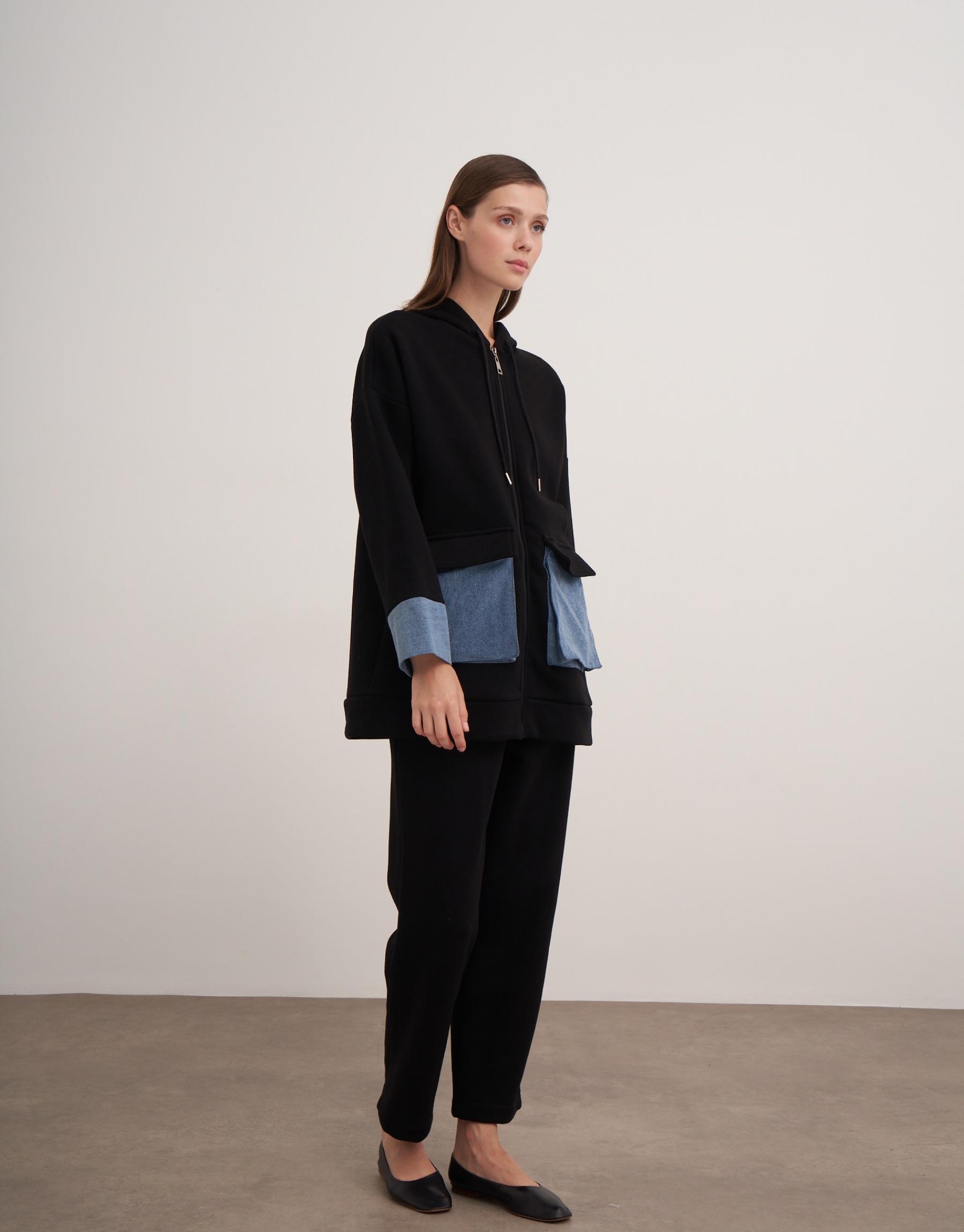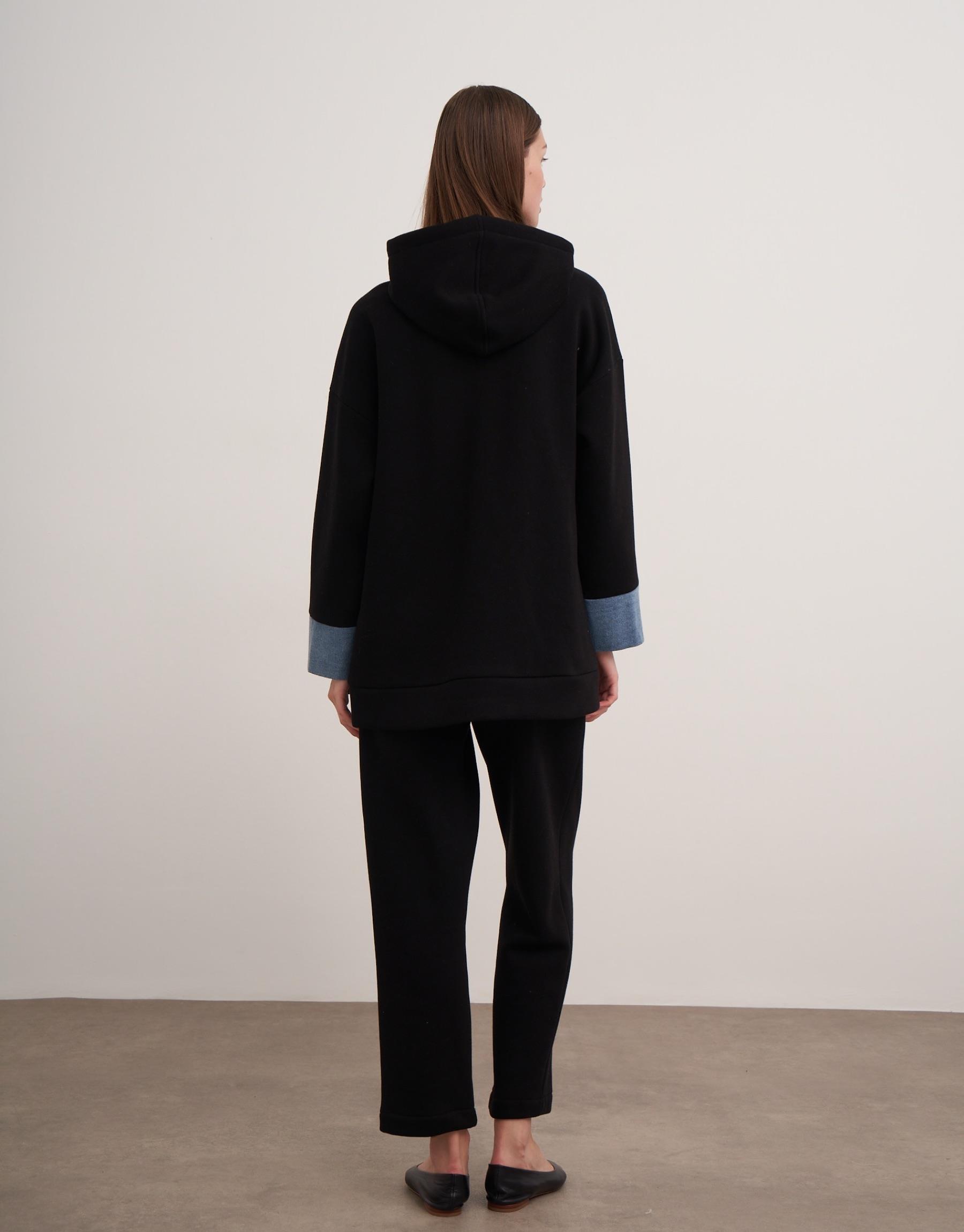 Hırkası denim detaylı kapüşonlu ve ön cepli, 3 iplik şardonlu Pantolon beli lastikli ve yan cepli ikili takım.