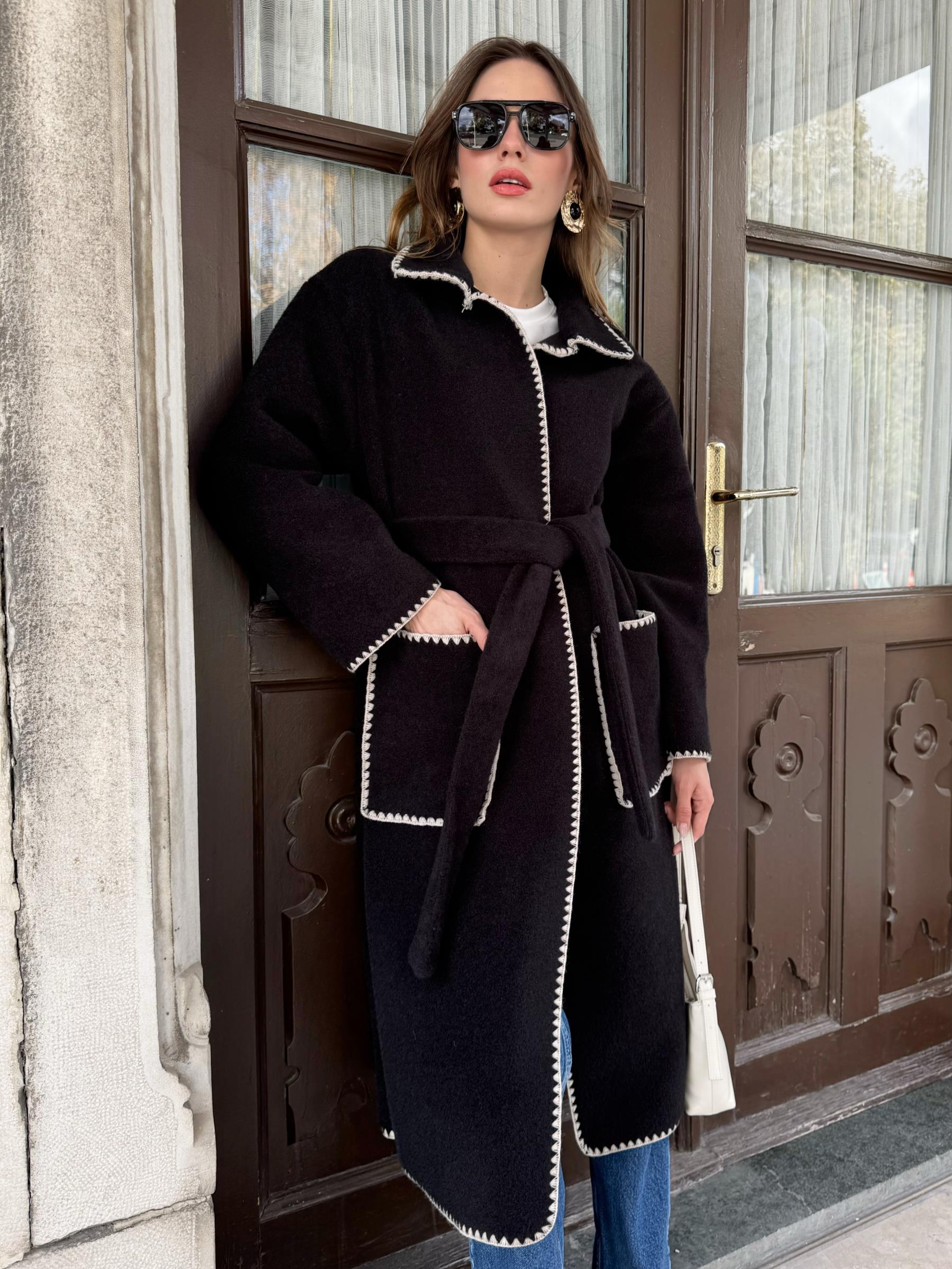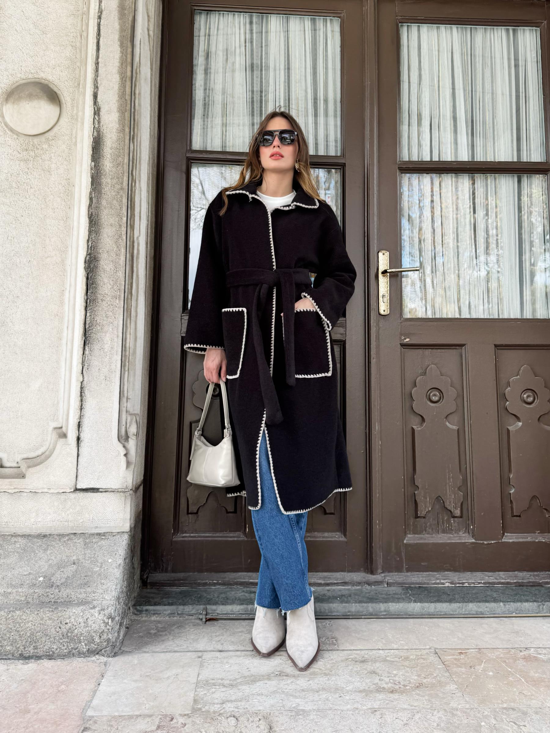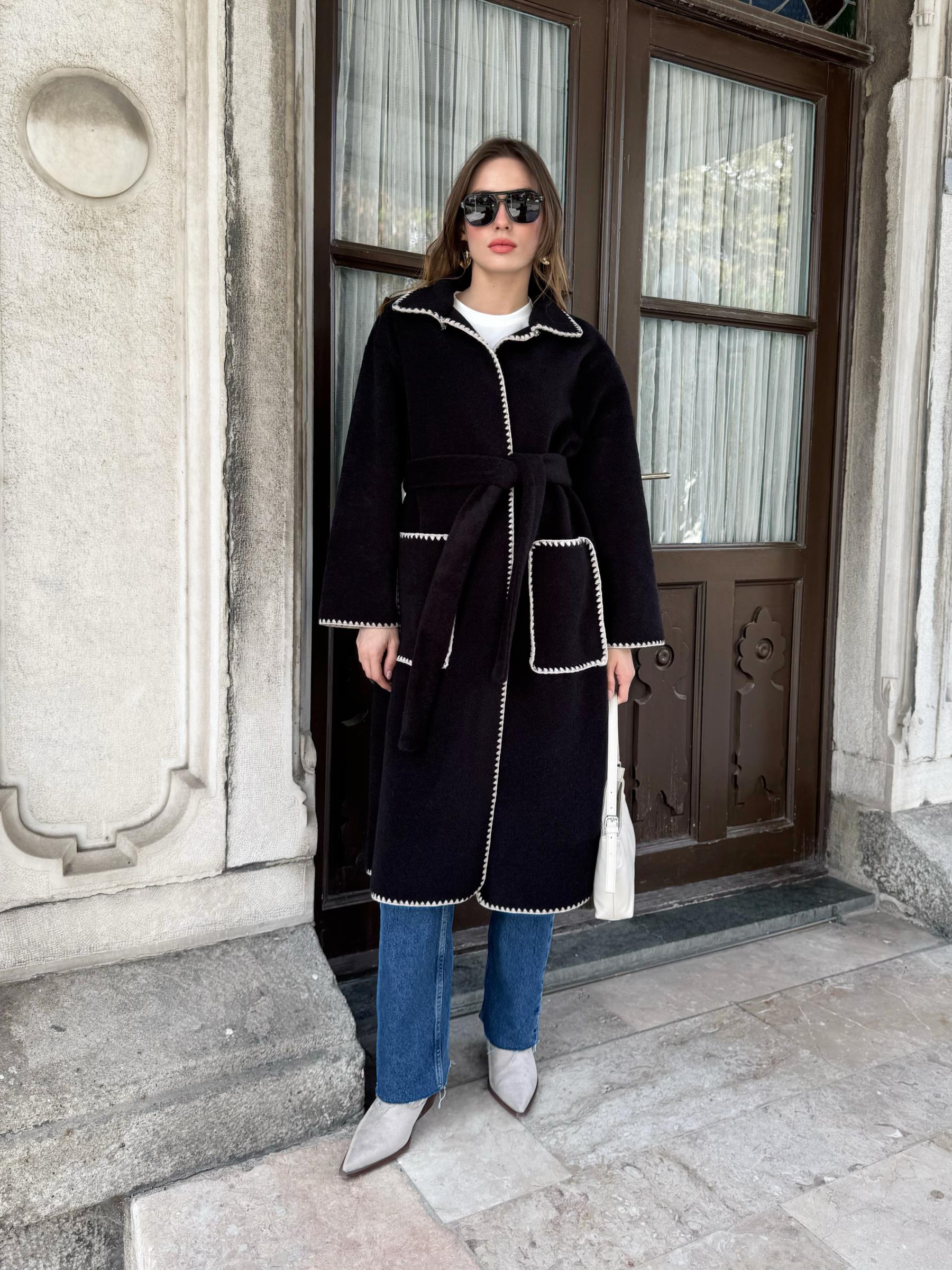 Çoban dikişli , seyyar kemerli ve ön cepli astarsız uzun kaşe kap. Kap boy 113cm göğüs ölçüsü 56cm dir.